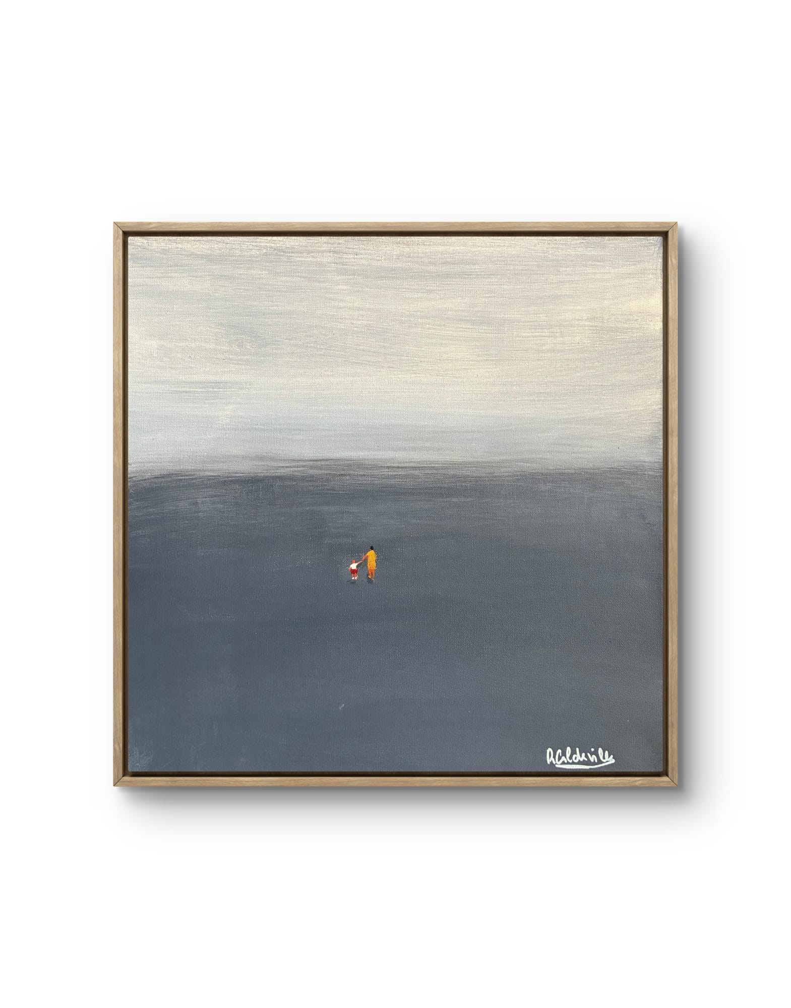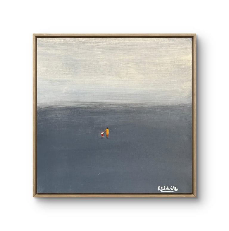 Este quadro minimalista apresenta uma paleta de cores neutras e suaves, com um horizonte difuso e dois pequenos elementos coloridos