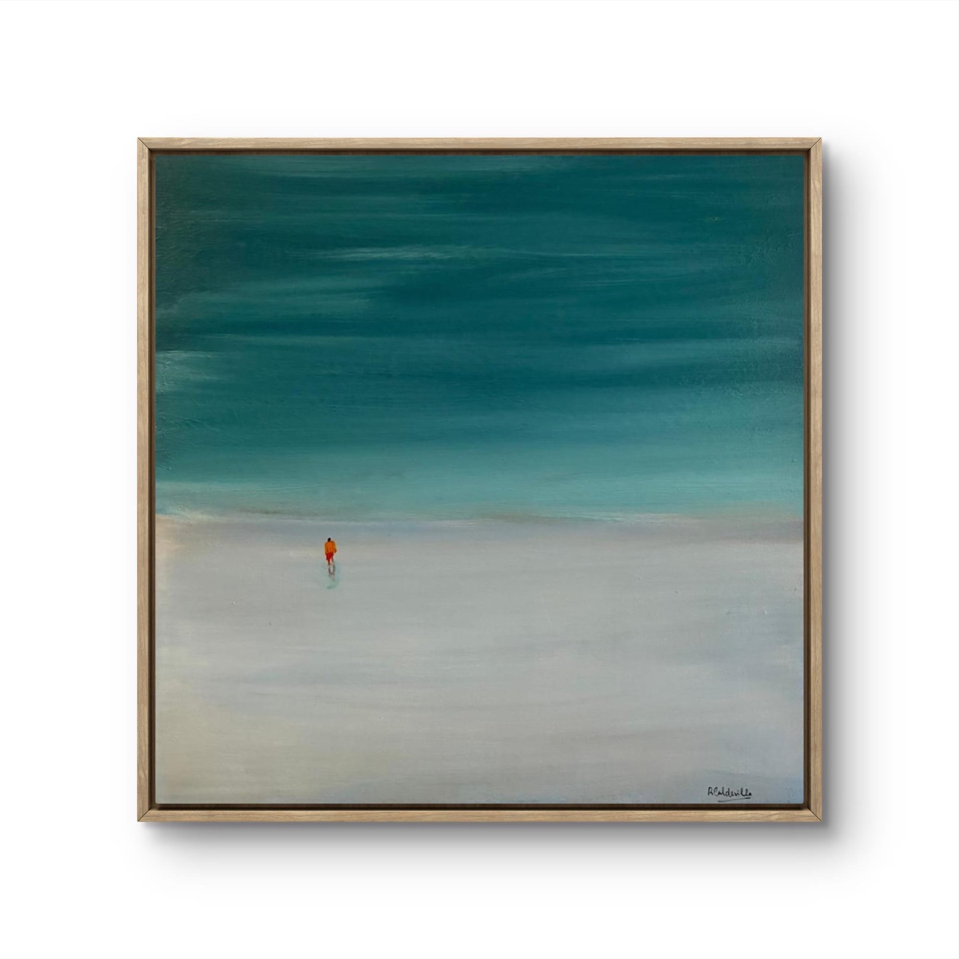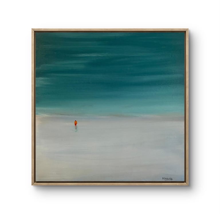 Descubra a serenidade desta obra com um cenário de praia deserta, realçado por um céu azul profundo e uma figura solitária que inspira contemplação.