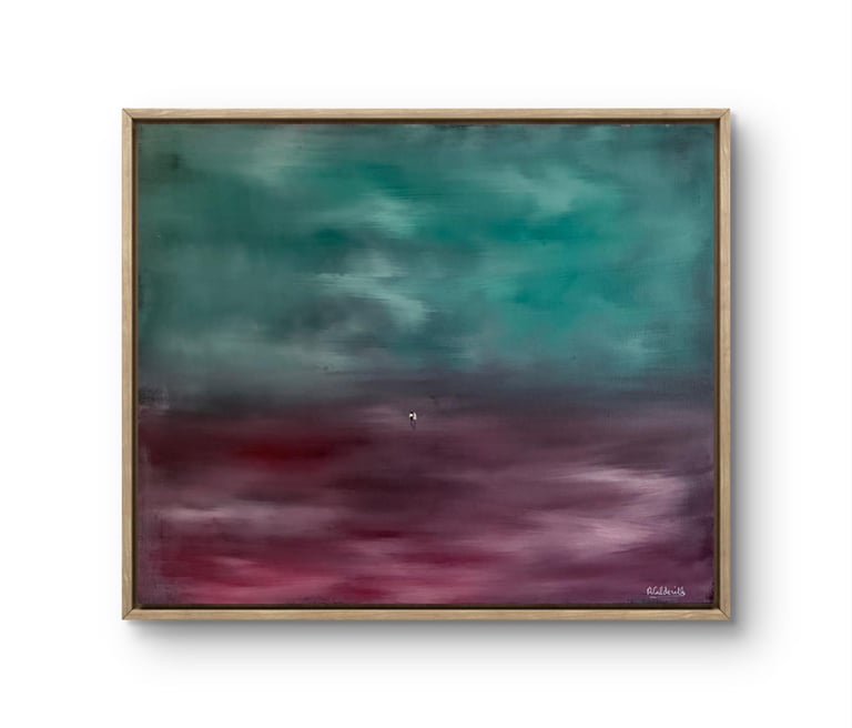 Este quadro oferece uma combinação única de tons verdes e roxos, criando uma atmosfera sofisticada e envolvente para qualquer ambiente.