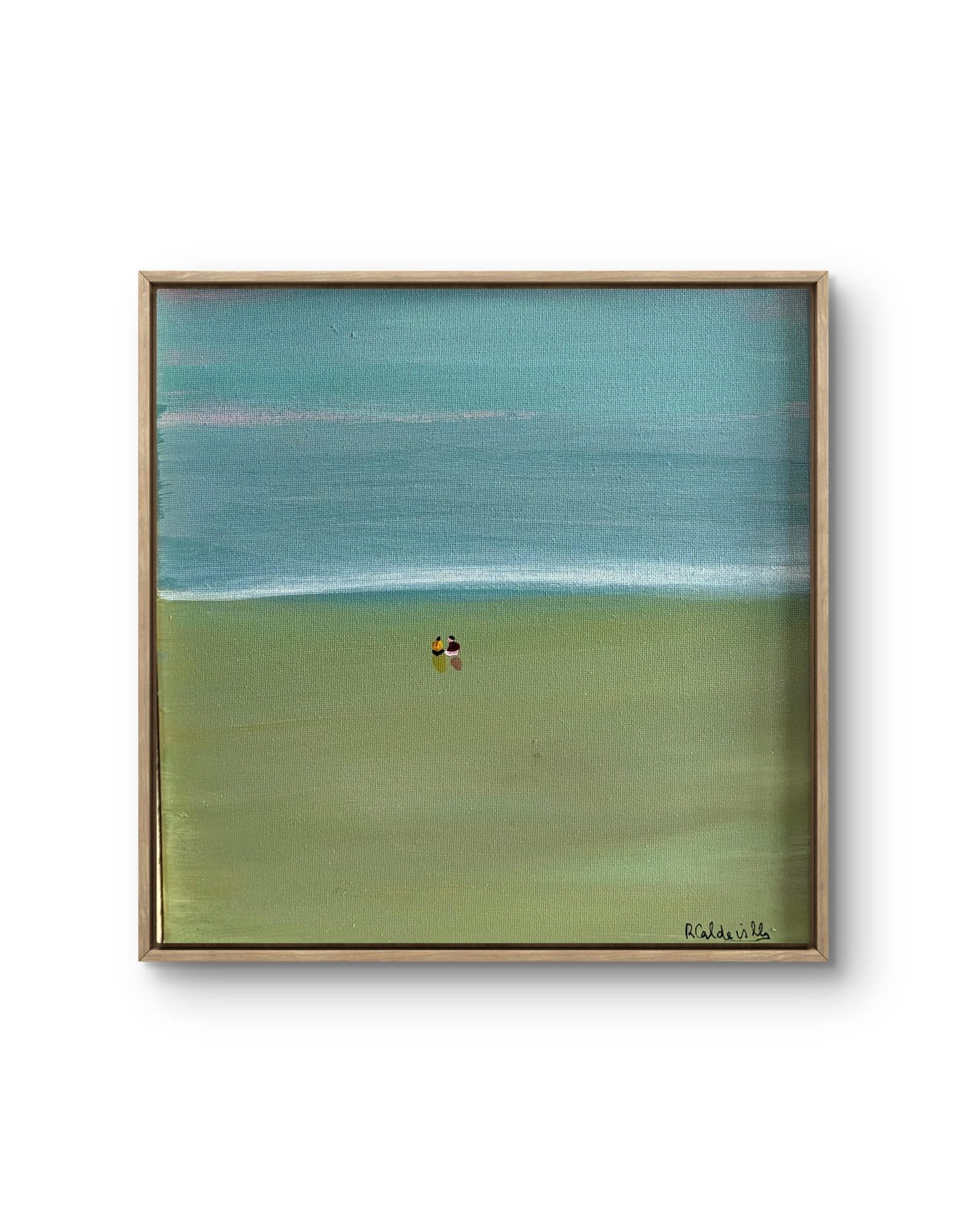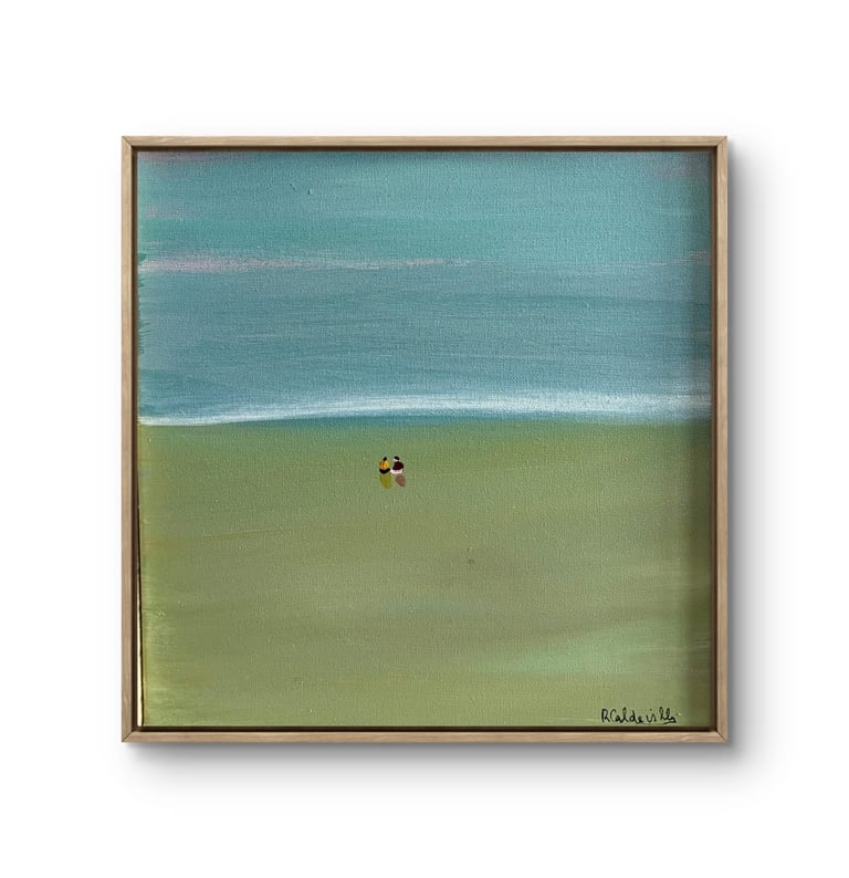 Este quadro apresenta uma cena minimalista de uma praia, transmitindo tranquilidade e sofisticação.