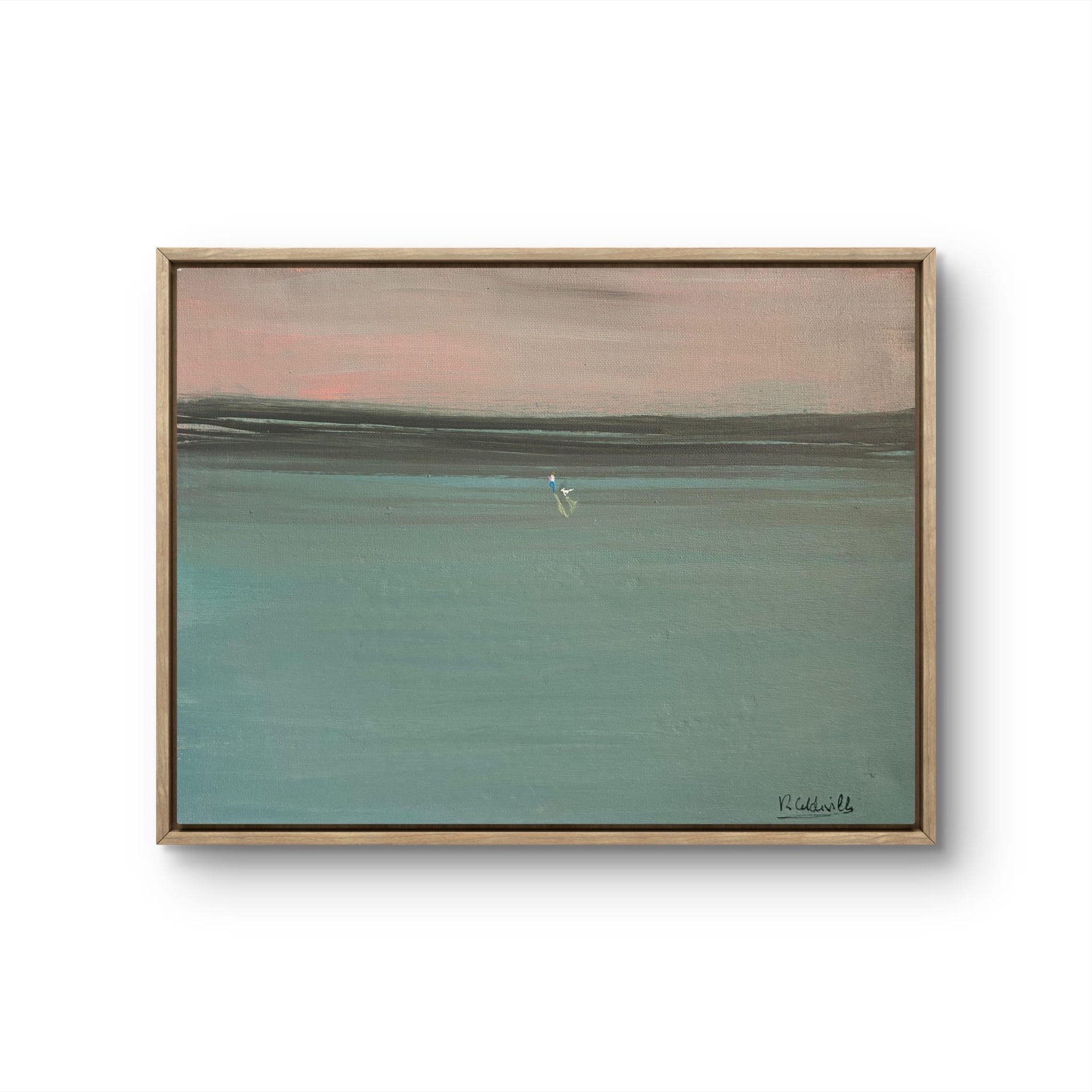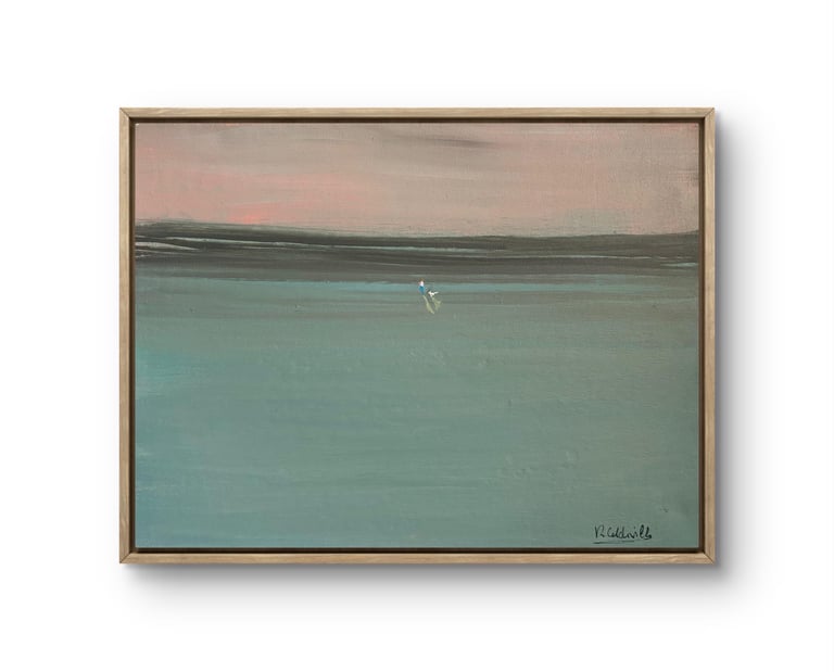 Este quadro exclusivo apresenta uma paisagem minimalista, combinando tons suaves e tranquilos de azul e verde pastel com um horizonte delicadamente iluminado.
