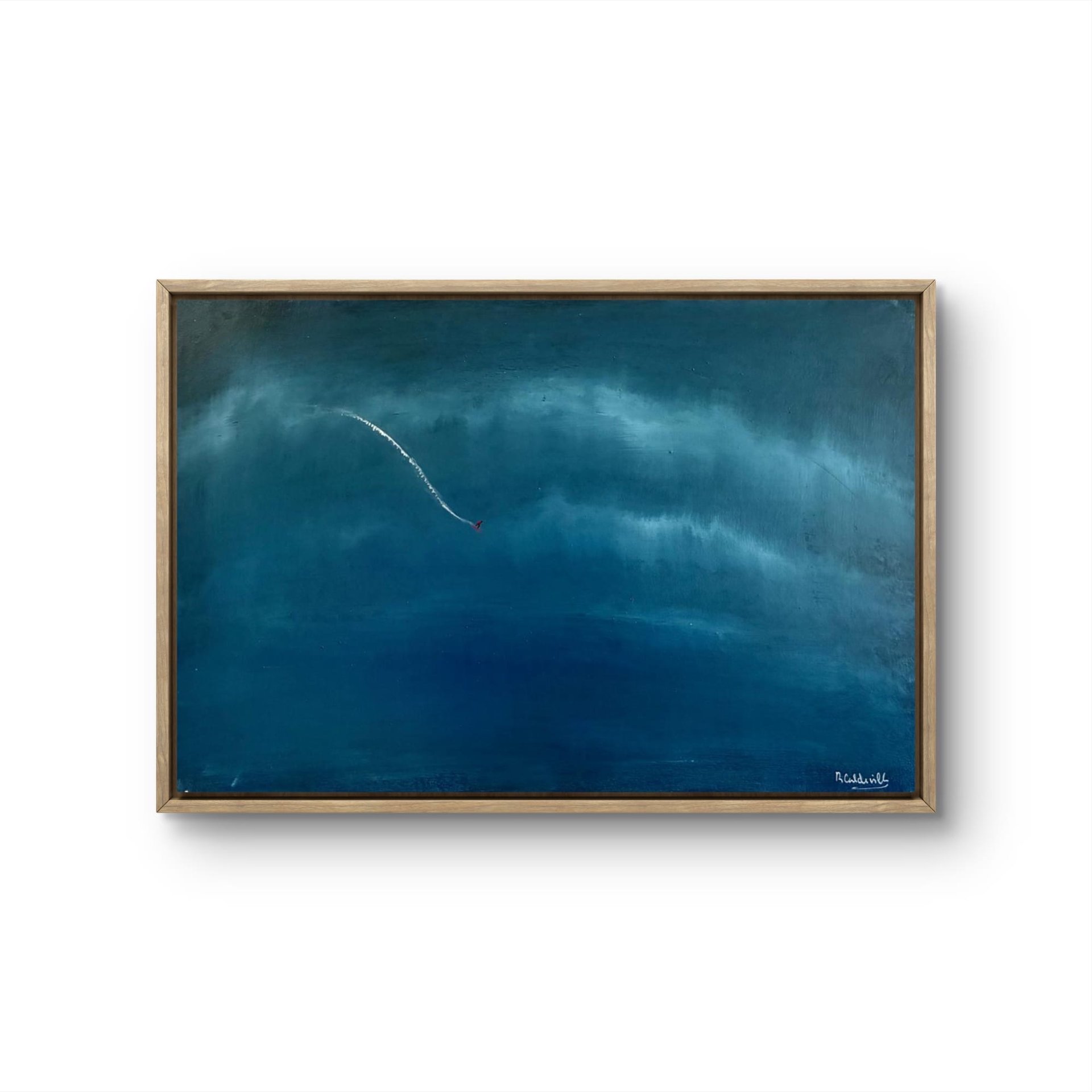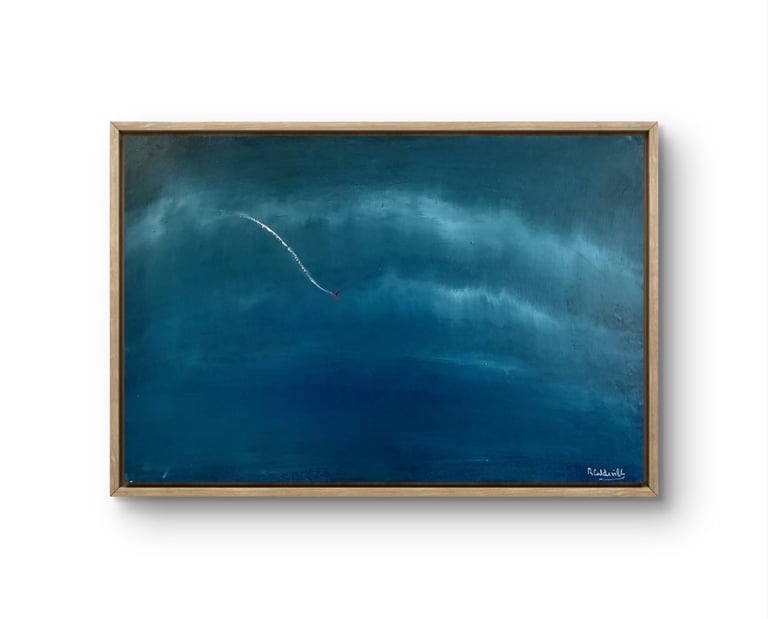 Este quadro traz uma atmosfera de tranquilidade, com tons de azul profundo e um traço delicado que sugere movimento e liberdade.