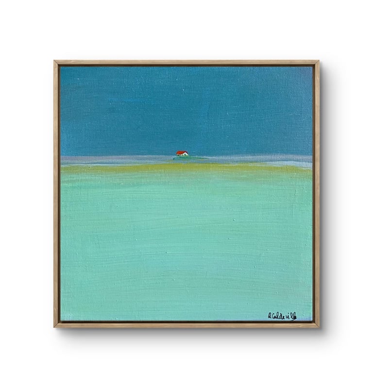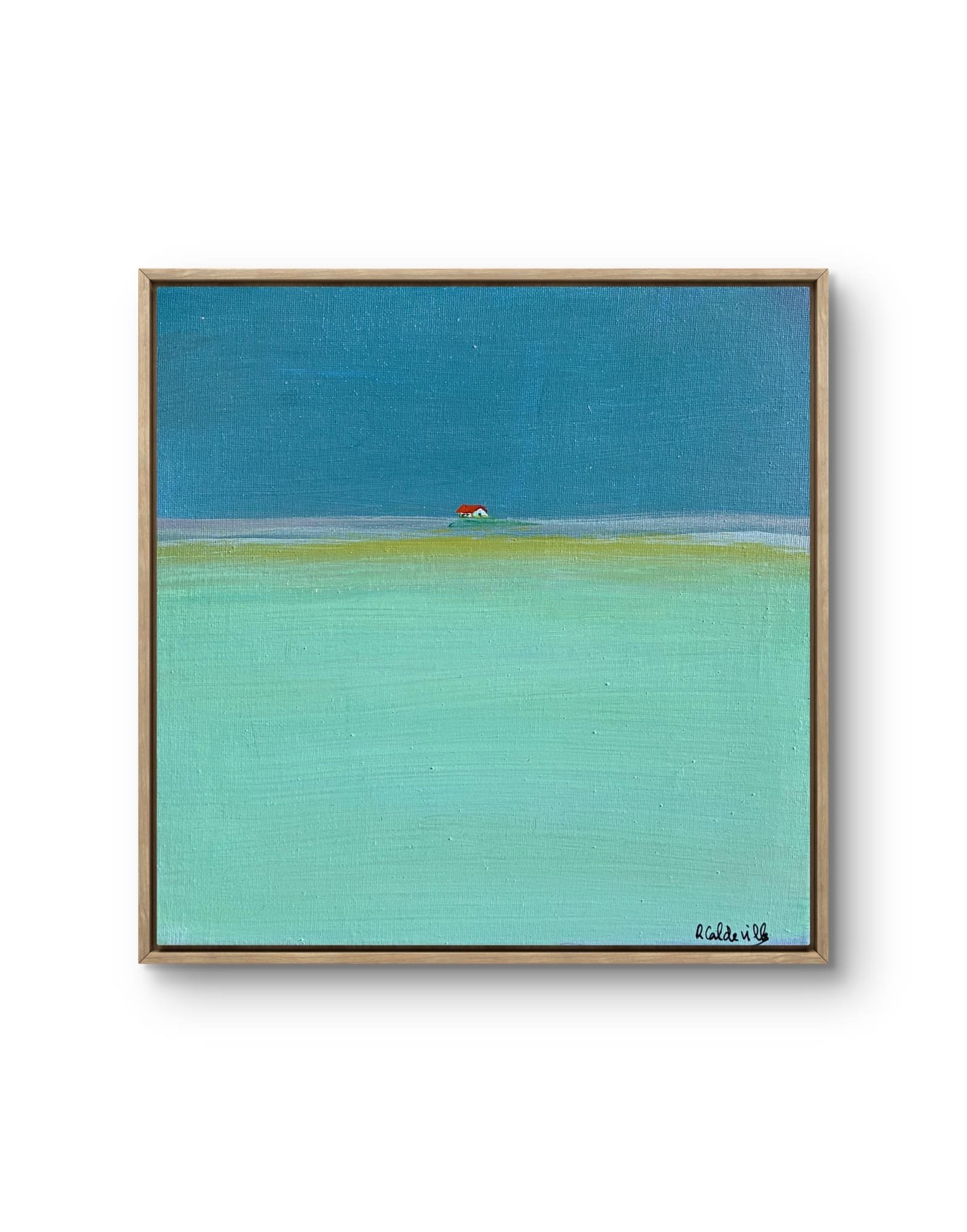 Pinceladas suaves e um ponto de cor destacam o horizonte, tornando